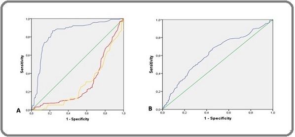 Figure 1. ROC Curve: A) Showing the relationship between RDW values and histopathological grading in BC patients, Yellow: Histopathological Grade 1, Red: Histopathological Grade 2, Blue: Histopathological Grade 3. B) Showing the relationship between RDW values and BC metastasis.