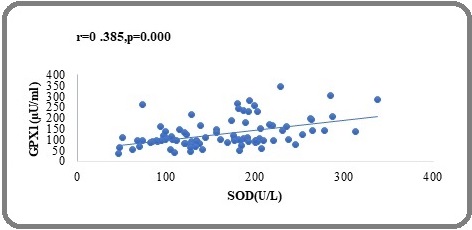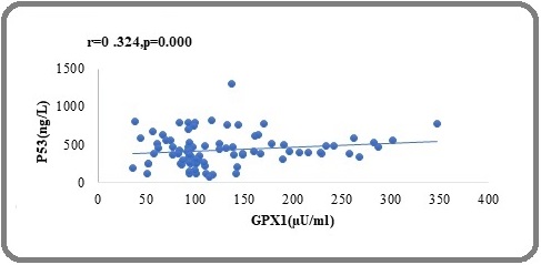 In breast cancer patients, P53 was considerably favourably connected with GPX (r=0.324, P<0.000), GPX1 was strongly positively correlated with SOD (r=0.385, P<0.000), Figure 1 and 2, showed a positive relationship in the biochemical variables.