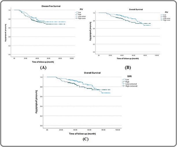 Figure 1. Kaplan-Meier Survival Curves Showing Correlation between Prognostic Indices and Survival Outcomes.(A) PIV and Disease-Free Survival (DFS), (B) PIV and Overall Survival (OS), and (C) SIRI and Overall Survival (OS).Each plot includes clearly labeled axes (Time of follow up (months) on x-axis and Survival Probability on y-axis), distinct curve labels (e.g., High vs. Low index groups).