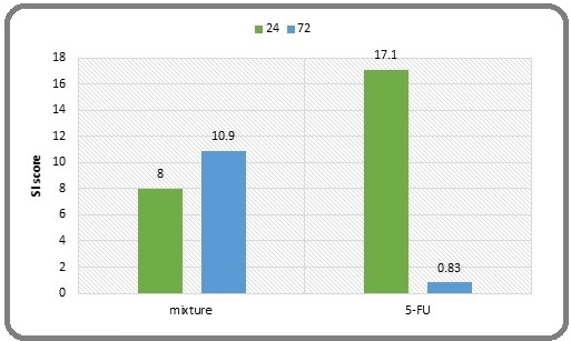 The selective toxicity index score was computed to assess the selective toxicity of the (Dapagliflozin– etoricoxib) mixture and 5FU on cancer cells following 24 and 72 hours of incubation. After establishing the IC50 levels for the mixture and 5FU, the selective cytotoxicity index was calculated using a mathematical formula based on cellular growth curves for HeLa and NHF cell lines [49].