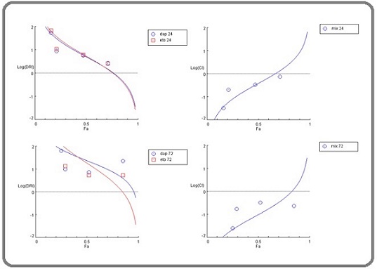 Compusyn, a computational simulator, calculated the combination index (CI) scores. This evaluation aimed to determine the potential for synergistic, additive, or antagonistic interactions among the mixture’s components. Concentration-effect curves illustrate the percentage of cells showing reduced growth concerning drug concentration, assessed after 24 and 72 hours of treatment.