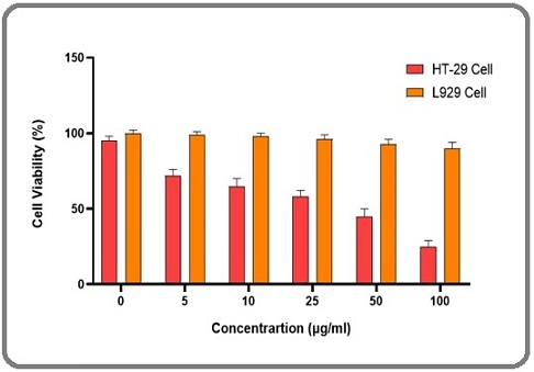 Human cancer cell lines (HT-29 for colon cancer ) were cultured in DMEM (Dulbecco’s Modified Eagle Medium) supplemented with 10% fetal bovine serum (FBS), 1% penicillin-streptomycin, and maintained at 37°C in a humidified 5% CO₂ incubator. Cells were sub-cultured upon reaching 70-80% confluence using trypsin-EDTA and seeded into appropriate culture plates for subsequent assays. All experiments were conducted under sterile conditions to ensure cell viability and reproducibility of results [19].