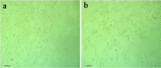 Morphological observations using an inverted microscope revealed distinct differences between control and treated cells. In Figure 4a, Untreated HT-29 cells maintained a normal epithelial-like morphology, exhibiting adherence, uniform shape, and intact membranes.