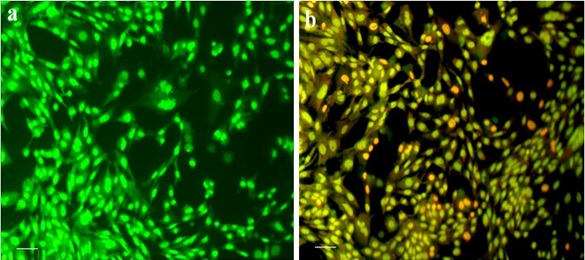 To further confirm apoptosis, dual staining with Acridine Orange (AO) and Ethidium Bromide (EtBr) was performed. Figure 5a, Fluorescent microscopy revealed green fluorescence in viable cells (AO-permeable), while early apoptotic cells emitted orange fluorescence and late apoptotic/necrotic cells appeared red (EtBr-permeable).