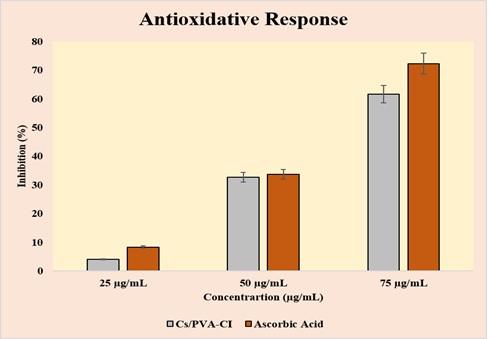 Figure 6. In vitro Antioxidant Activity of Cs/PVA-CI Versus Ascorbic Acid at 25, 50, and 75 µg/mL, Showing Concentration-dependent Inhibition.