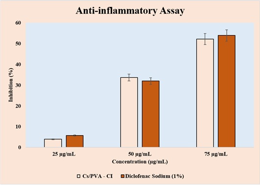 Figure 7. In vitro Antiinflammatory Activity of Cs/PVA-CI Versus Diclofenac Sodium at 25, 50, and 75 µg/mL, showing concentration-dependent inhibition.