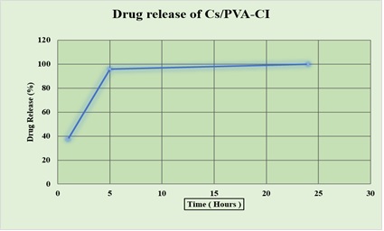 Figure 8. In vitro Drug Release Profile of Cs/PVA – CI Showing Rapid Initial Release within 5 hours and Sustained Release up to 24 hours, Reaching nearly 100% Cumulative Release.