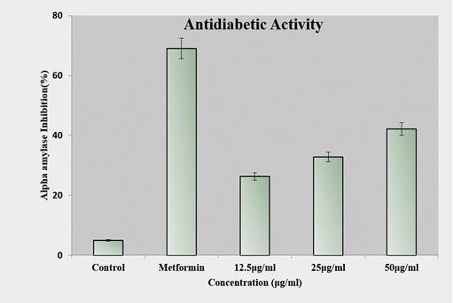 The antidiabetic activity of the test sample was evaluated by measuring its ability to inhibit α-amylase activity at different concentrations (12.5, 25, and 50 µg/ml) compared to the standard drug, Metformin. As shown in Figure 9, the test sample exhibited a dose-dependent increase in α-amylase inhibition.