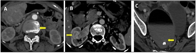 Figure 1. CECT Abdomen and Pelvis of a 70-year-old female Showing: A-Growth in the stomach with heterogeneous enhancement.B-Intensely enhancing exophytic right renal mass. C-Right ovarian dermoid cyst with peripheral calcification.