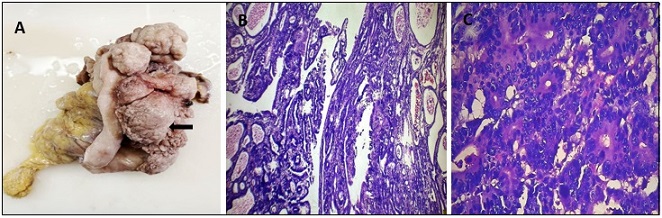 Figure 2. A- Gross Picture Showing Distal Gastrectomy Specimen with Multiple Polypoidal, Growth Arising from Lesser Curvature. B- Microscopy, showing tumor cells arranged in glandular pattern of varying size and shape with focal area showing cribriform structures. (H and E stain -4X) C- Tumor cells exhibiting moderate pleomorphism with scant cytoplasm, high NC ratio, hyperchromatic to vesicular nuclei.(H and E stain -10X).