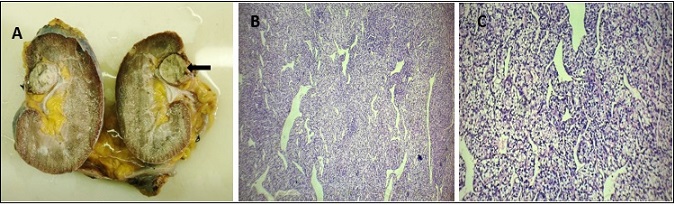 Figure 3. A- Gross Picture of Right Radical Nephrectomy Specimen, on Cut Surface Shows Single Well circumscribed Tumor in the Upper Pole of Kidney Near renal Sinus. B- Microscopy shows Tumor cells arranged in sheets, cords and nests.(H and E stain -4X) C-Tumor cells with distinct cell membrane and clear cytoplasm. (H and E stain-10X).
