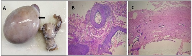 Figure 4. A- Gross Picture of Right Ovarian Cystectomy Specimen with Uterus and Cervix, Bilateral Fallopian Tubes and Left Ovary. External surface of right ovary is enlarged, smooth, glistening with intact capsule. B- Microscopy shows cyst wall lined by stratified squamous epithelium with pilosebaceous unit and apocrine glands. (H and E stain-10X) C-Microscopy shows mature neural tissue with focal calcification. (H and E stain-10X).