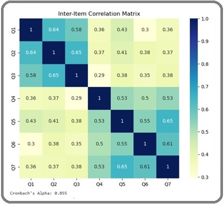 Inter-item correlation analysis was performed to evaluate the relationships between individual scale items and assess the dimensionality of the CDAS. The correlation matrix, presented in Figure 1, revealed moderate to strong positive correlations among items within the same factor, providing additional evidence supporting the scale’s two-factor structure.