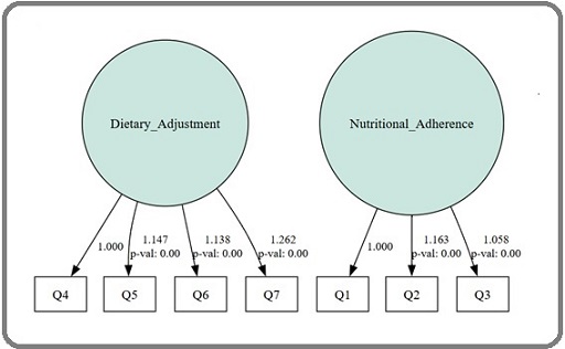 The variance estimates for the latent factors were also statistically significant (p < 0.001), with values of 0.301 for Nutritional Adherence and 0.249 for Dietary Adjustment. These values indicate that both factors explain meaningful variance in their respective indicators and contribute substantially to the measurement of dietary adherence. The path diagram illustrates the CDAS’s two-