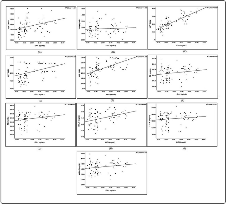 Figure 2. Correlation between IDO1 levels and A: Age, B: BMI, C: ALT, D: AST, E: ALP, F: TG, G: TC, H: HDL-C, I: LDL-C, J: VLDL-C.