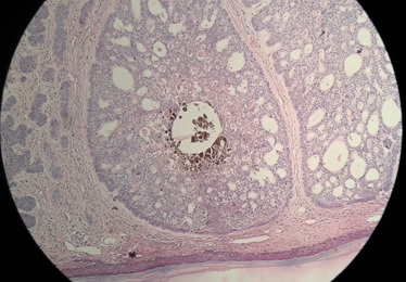 Figure 2. Low Power View of H and E Staining of Eyelid Mass Showing Adenoid Basal Cell Carcinoma .