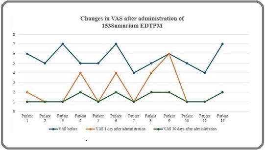 Moreover, a reduction in pain, as measured by the Visual Analog Scale (VAS), was observed after treatment. One day post-administration, the VAS score decreased from an initial 5 (ranging from 4 to 7) to 2 (ranging from 1 to 7), with a statistically significant P-value of 0.003. This indicates that Samarium-153 provides effective short-term pain relief for patients with osteoblastic bone metastases. Further improvement was noted 30 days post-treatment, with the VAS score dropping to 1 (ranging from 1 to 2), and a P-value of 0.002, demonstrating sustained pain relief. These results suggest that Samarium-153 not only offers rapid pain relief but also maintains its efficacy over an extended period, thus significantly enhancing the quality of life for patients suffering from metastatic bone pain.