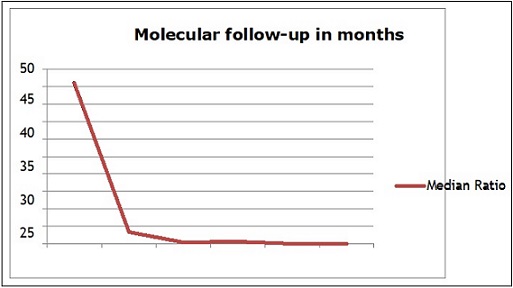 The median BCR-ABL1/ABL1 ratio was 46% (range: 12–100). During molecular follow-up, a significant decline in the BCR-ABL1/ABL1 ratio was observed. It decreased from a median of 46 IS at diagnosis to 3.45 IS after 3 months of follow-up (p<0.0001), to 0.067 IS after 12 months of treatment (p<0.0001), and finally to 0.01 IS at 18 months (p<0.0001) (Table 2; Table 3, Figure 1).