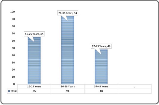The cross-sectional descriptive study was conducted among women aged 15 to 49 years attending the outpatient departments of TMSS Medical College and Rafatullah Community Hospital (RCH) in Bogura, Bangladesh. Data were collected through structured questionnaires administered via face-to-face interviews. A total of 207 respondents participated in the study. Regarding the socio-demographic profile, the majority of respondents identified as Muslim, accounting for 193 individuals (93%), followed by Hindu respondents at 13 (6%) and Christian respondents at 3 (1%). Age distribution of the respondents showed that 65 women (31.4%) were between 15 and 25 years, 94 women (45.4%) were in the range of 26 to 36 years, and 48 women (23.2%) were between 37 and 49 years old (Figure 1).