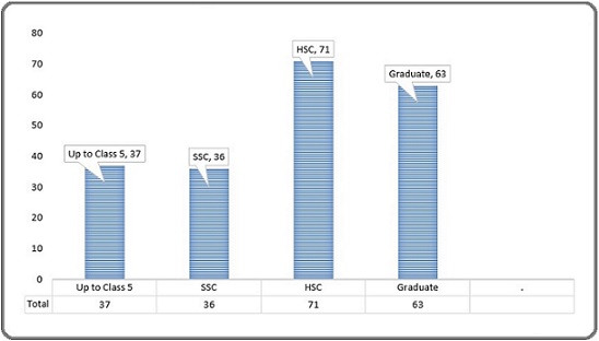 Among 207 respondents were recruited for this study. Educational qualification status reveals 37 (17.8%) respondents were belongs to class five, 36 (17.4%) respondents were belongs to SSC, 71 (37.3%) respondents were belongs to HSC, 63 (34.3%) respondents were belongs to graduate (Figure 2).