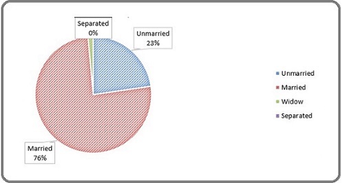 Among 207 respondents were recruited for this study. Marital status of the respondents reveals unmarried were 47 (23%), married were 157 (76%), Widow were 3 (1%) and separated (0%) (Figure 3).