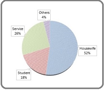 Among 207 respondents were recruited for this study occupational distribution status reveal: Housewives were 108 (52%), students were 37 (18%), service holders were 54 (26%) and others were 8 (4%) (Figure 4).