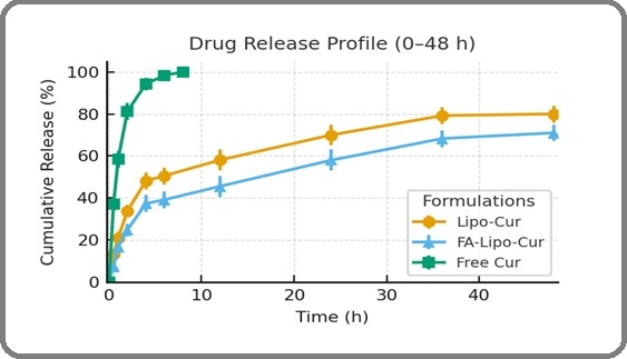 The release of curcumin from non-targeted liposomes (Lipo-Cur) and folate-conjugated liposomes (FA-Lipo- Cur) was evaluated using a dialysis diffusion method under verified sink conditions. Briefly, 1 mL of each formulation was loaded into a pre-soaked dialysis bag (MWCO 12 kDa) and immersed in 50 mL of phosphate-buffered saline (PBS, pH 7.4) containing 0.5% (w/v) Tween-80 to maintain sink conditions and prevent drug adsorption to the membrane. The system was maintained at 37 ± 0.5 °C with gentle shaking (100 rpm). Sink conditions were verified by ensuring that the cumulative concentration of released curcumin never exceeded 20% of its solubility in PBS (pH 7.4, 0.5% Tween-80, 120 µg/mL at 37 °C). To confirm stability of curcumin during the 48 h study, a control solution of free curcumin (10 µg/mL) was incubated under identical conditions, and no visible precipitation or significant degradation (<5% loss at 425 nm) was observed. At predetermined time intervals (0.5, 1, 2, 4, 6, 12, 24, 36, and 48 h), 1 mL of the release medium was withdrawn and replaced immediately with an equal volume of fresh PBS (37 °C). Cumulative release values were corrected for sample replacement using the standard dilution formula. Curcumin concentration was quantified by UV–Vis spectrophotometry at 425 nm against blank liposome controls and converted to cumulative release (%) using a standard calibration curve.
