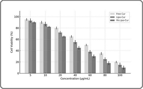 Both liposomal formulations demonstrated greater cytotoxicity than free curcumin, indicating improved intracellular delivery and enhanced bioavailability. Quantitative analysis of the IC₅₀ values (Table 2) revealed that FA-Lipo-Cur exhibited the lowest IC₅₀ (33 ± 3.3 µg/mL), followed by Lipo-Cur (45 ± 3.9 µg/mL) and free curcumin (55 ± 4.1 µg/mL).