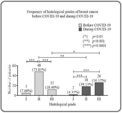 Comparison between groups showed significantly more grade III tumors during COVID (p < 0.05) and more grade II tumors before COVID (p < 0.001).
