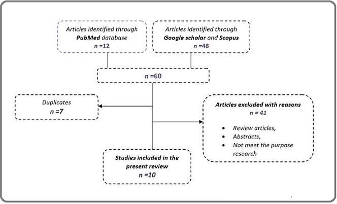 This study was conducted to show the role of miR-204 in AML by reviewing the published results on this topic. The bibliographic search was conducted on the electronic databases PubMed, Scopus, and Google Scholar. By using the following keywords: “acute myeloid leukemia; AML; microRNA-204, hsa-mir-204; miR-204”. We also searched the references cited in selected studies. The selected studies were screened (by reading the title, the abstract, and the entire article); studies linked to our subject were included in the present review, while duplicate publications, case reports, reviews, and studies that not meet the purpose of the research were excluded. The search strategy retrieved 60 articles. Of these articles, 10 were eligible for the present review. The aforementioned steps concerning the selection of studies are illustrated in detail in Figure 1.
