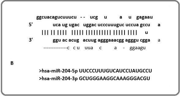 Figure 2. Sequence of miR-204: A Stem-loop structure of miR-204; B mature sequences of miRNA 204-5p and 3p. (http://mirbase.org/)..