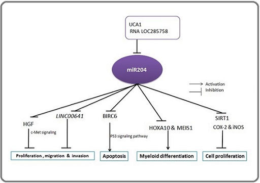 MiR-204 (microRNA-204) has been demonstrated to have crucial physiological roles in retinal development and formation of adipocytes from stem cells. In cancer, it influences the tumor initiation, growth, and progression by regulating angiogenesis, apoptosis, and metastasis processes. MiR-204 has many direct target genes, coding for proteins involved in tumorigenesis of different cancer types, such as BCL-2 (an apoptosis regulator) in gastric cancer, JAK2 (a tyrosine kinase) in breast cancer, RUNX2 (a transcription factor) in prostate cancer, SOX4 (a transcriptional regulator) in acute lymphoblastic leukemia, and EPHB2 (a receptor tyrosine kinase) in glioma [13, 14]. In this review, I reported the role of miR-204 in AML based on published experimental studies.