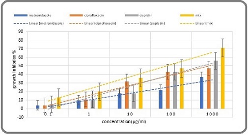 The cytotoxicity and safety characteristics of metronidazole, ciprofloxacin, cisplatin, and the metronidazole-ciprofloxacin mixture were examined by evaluating the viability of cancerous and healthy normal cells at concentrations ranging from 0.1 to 100 µg/ml for each treatment.
