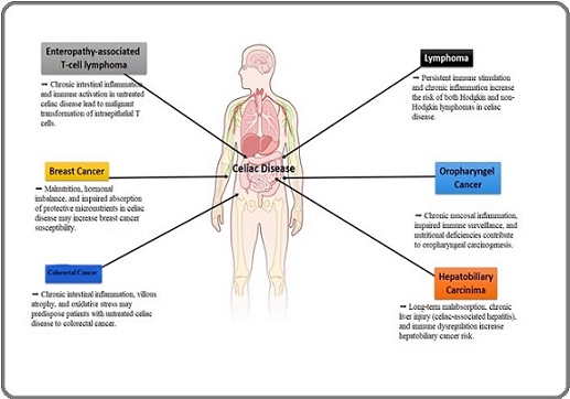 Abstract Introduction Esophageal cancer (EC) Colorectal Cancer (CRC) Small Intestine Adenocarcinoma (SBA) Lymphoma Primary liver cell cancer/Hepatocellular Carcinoma (HCC) Breast Cancer (BC) Oropharyngeal Cancer (OPC) Endometrial Cancer Ovarian Cancer (OC) The main mechanisms of the association between celiac disease (CD) and cancer Relationship between celiac disease (CD) and cancers Diagnose types of cancers in patients with celiac disease (CD) The link between cancer and children with celiac disease (CD) Association between gluten-free diet (GFD) and various cancers Acknowledgments ReferencesLicense
