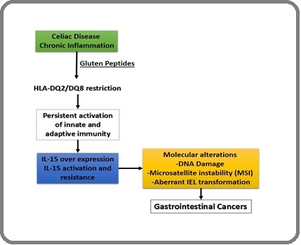 Continuous gluten consumption in people with CD causes their innate and adaptive immune systems to be constantly activated (increased interleukin 15, IFN-γ, TNF-α). This factor creates a tumor microenvironment associated with oxidative stress, DNA damage, and gene mutations. Cancers such as enteropathy-associated T-cell lymphoma (EATL) and small intestinal adenocarcinoma are closely related to this pathway.