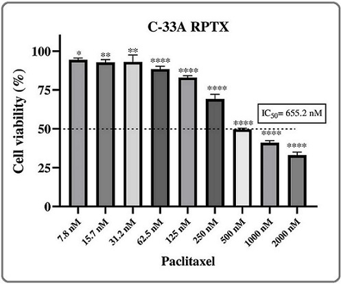 Figure 2. Cell Viability Curve of C-33A RPTX Cells Treated with Paclitaxel. Treatments with 7.8, 15.6, 31.2, 62.5, 125, 250, 500, 1000, and 2000 nM of paclitaxel for 72 h were employed. The mean and error bars of the percentage of cell viability were plotted. * p<0.05; ** p<0.01; **** p<0.0001 .