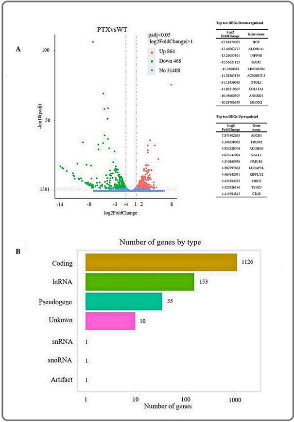 Figure 3. Differential Expression Analysis and Gene Classification of Transcriptomics in C-33A and C-33A RPTX Cells. Volcano plot graphs showing upregulated (864) and downregulated (468) genes (A). Bar graph of 1332 classified DEGs (B); 1126 (85%) of all RNAs are coding genes, 153 (11.5%) are long non-coding RNAs, 35 (2.6%) are pseudogenes, 10 (0.7%) are unknown genes, and the remaining include a snRNA, snoRNA, and artifacts.