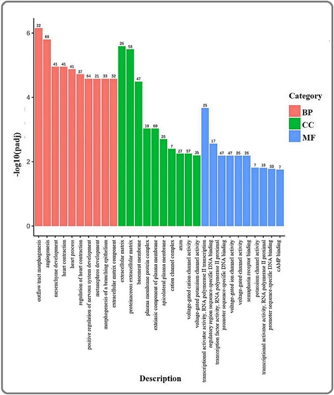 The GO analysis of the DEGs revealed that genes with a minor adjusted p-value (p < 0.05) were associated with biological processes such as angiogenesis, mesenchyme development, morphogenesis of a branching epithelium, and other biological processes related to the heart (Figure 4).