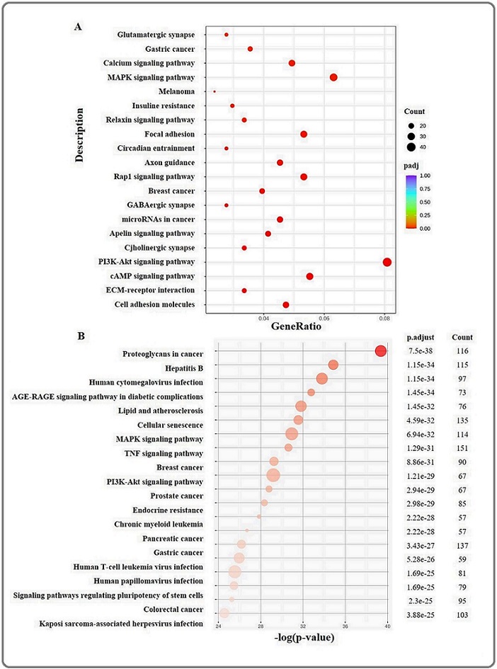 The enrichment analysis of gene ontology showed that KEGG analysis associated DEGs (coding) with cancer and chemoresistance signaling pathways, such as calcium signaling, MAPK signaling, focal adhesion, Rap1 signaling, PI3K-Akt signaling, cAMP signaling, ECM-Receptor, and Cell adhesion.