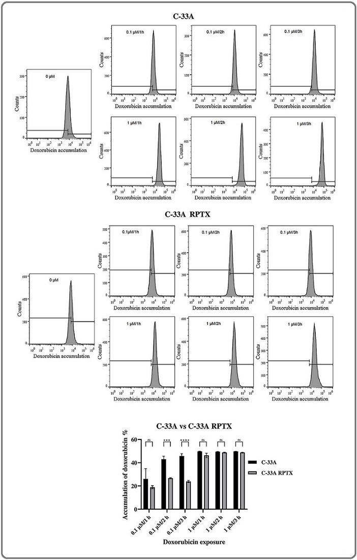 3x105 C-33A or C-33A RPTX cells were cultured per well in 6-well plates. After overnight, the cells were treated with 0.1 µM doxorubicin for 2 h. Subsequently, the cells were washed with PBS and collected by trypsin 0.25 %. The cells were then centrifuged at 1000 rpm for 3 min and washed with PBS. Cells were resuspended in 1 mL of PBS and analyzed by flow cytometry. Ten thousand events were acquired for each sample. The histograms were made and analyzed by FlowJo software to compare the doxorubicin cell accumulation in both C-33A and C-33A RPTX cells.