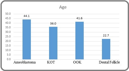 Consistent with the demographic data summarized in Table 1, ameloblastomas (mean age 44.1 years) and OOK lesions (41.6 years) predominantly occurred in middle-aged individuals, whereas KOTs showed a slightly younger age profile (36.0 years). In contrast, dental follicles, used as the control group, were observed in significantly younger patients (mean age 22.7 years). The diagram emphasizes the distinct age-related patterns of odontogenic lesions, supporting the known epidemiological characteristics of these pathologies.