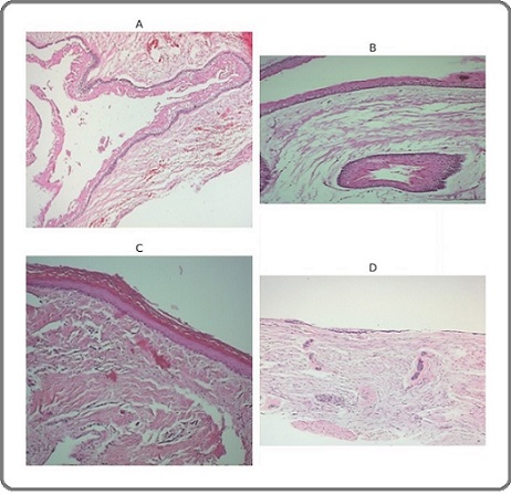 Representative histopathological features are shown in Figures 3A–D, including unicystic ameloblastoma (Figure 3A), keratocystic odontogenic tumor (Figure 3B), orthokeratinizing odontogenic keratocyst (Figure 3C), and odontogenic epithelial rests in dental follicle tissue (Figure 3D).