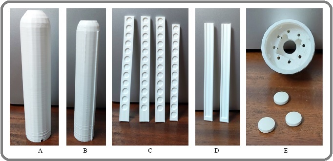 Figure 1. The Parts of a 3D Printed Brachytherapy Applicator. A) External body; B) Internal body; C) Components for TLD placement D) Components for film placement; and E) Fixation cap and 3D-printed compensating buttons.