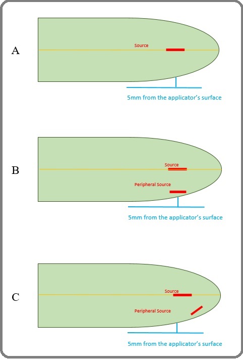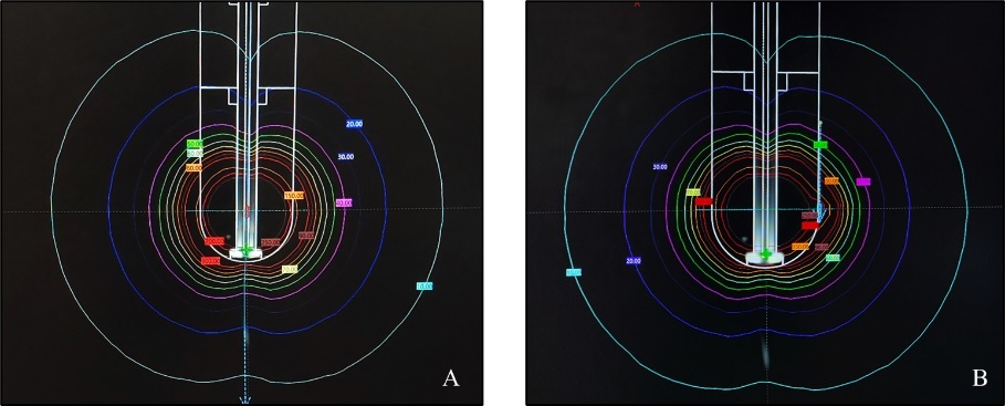 This can result in an unintentional increased dose to healthy tissues, similar to the treatment side. However, by adding a peripheral source to the central one, the dose symmetry was altered. This reduces the excess dose provided to healthy tissue on the untreated side (Figure 10 B). The weightage of the dwell time for each source effects the asymmetric dose distribution, which varies based on clinical demands.
