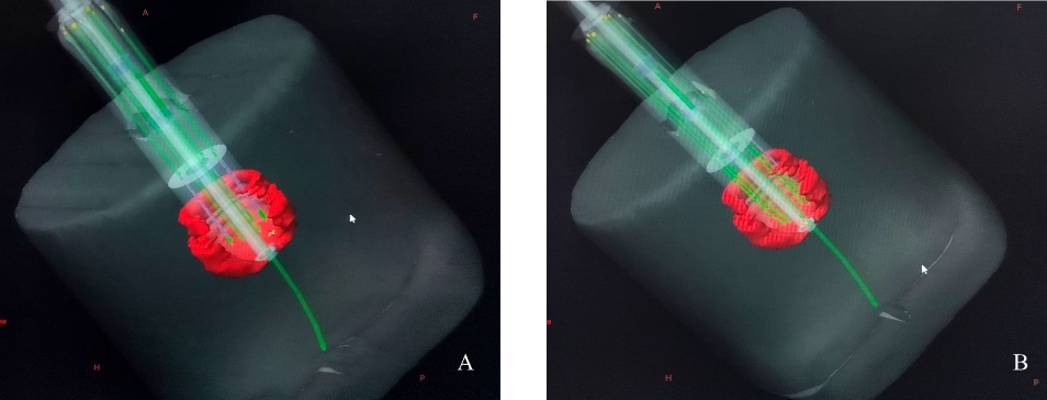 At the apex, the volumetric optimized flexible catheters plan (Figure 14 (B)) enhanced lateral dose distribution marginally while decreasing hot volume compared to the manually optimized plan (Figure 14 (A)). Figure 16