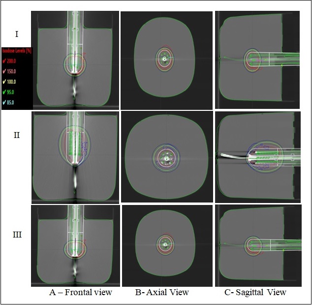 Figure 14. Dose Distribution Obtained with Central Tandem Alone (I), Manually Optimized Dose Distribution with Peripheral Sources Loaded with Needles (II) and Loaded with Flexible Catheters (III) along with Central Source for the Given Target Volume GTVp.