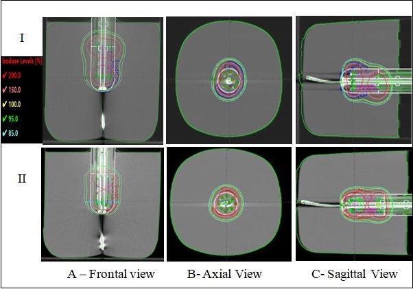 Figure 15. Volumetrically Optimized Dose Distribution Using Peripheral Sources Loaded with Needles (I) and Flexible Catheters (II), Coupled with the Central Source for the Given Target Volume GTVp.