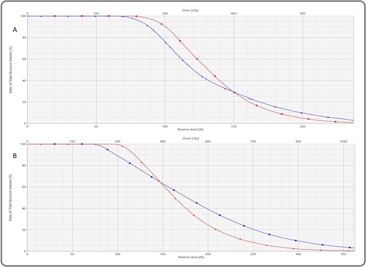 Figure 17. Dose Volume Histogram of GTVp Target. Manual optimization (A) and Volume optimization (B) plans with peripheral sources loaded with needles (blue line) and flexible catheters (red line), combined with the central source.