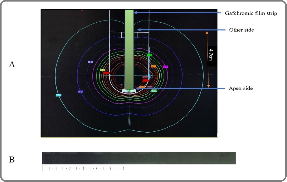 Figure 18. A) A Schematic Diagram Showing the Gafchomic Film Inside the Applicator and the Distance from the Applicator's apex where the Film Readings were Started up to 2.5cm in the Axial Line. B) Irradiated films with ruler.