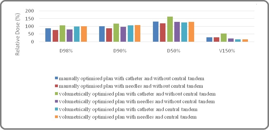 Besides, an asymmetric GTVp volume was drawn on the CT images, and plans were created and dose was prescribed to the target volume GTVp. Source was loaded at the peripheral catheters and the dose was normalised to the target volume. Simillarly, one more plan with needles at the peripheral was done. Tumor coverage for both plans was compared to determine the relevance of the curve at the applicator’s apex, which only allows the flexible catheter to pass. Finally, a plan with only the central tandem was created to simulate the routine practice conditions. Using Dose Volume Histogram (DVH), D98%, D90%, D50%, and V150% values for the GTVp were recorded and compared between the plans as per ICRU89.